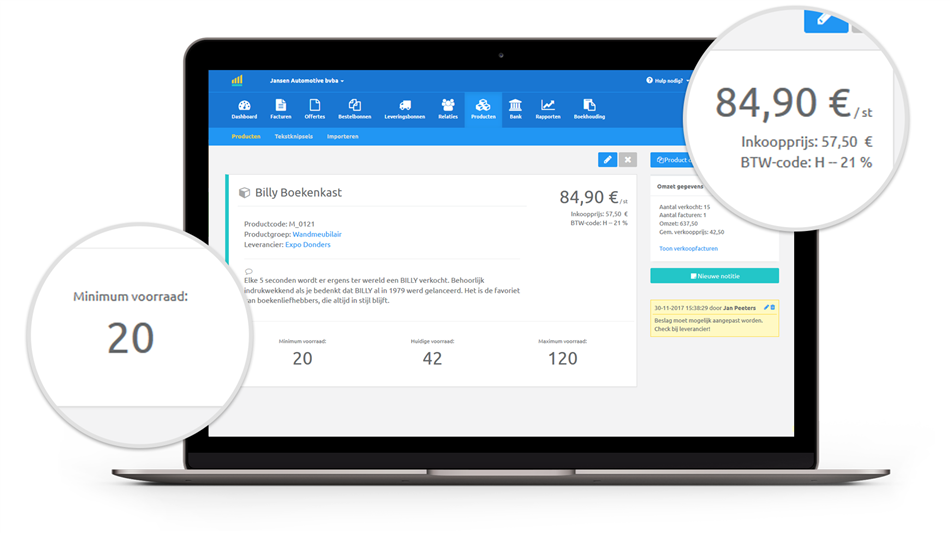 Bilansoft houdt als je dat wil van al je producten de voorraad bij. In het product overzicht zie je het meteen als van een product de minimum voorraad bereikt is.featuretext