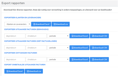 Klanten en leveranciers, ontvangen en uitgaande facturen kun je op ieder moment exporteren naar een Excel of CSV bestand. Dat is handig als je snel een overzicht wil bezorgen aan bv je boekhouder.