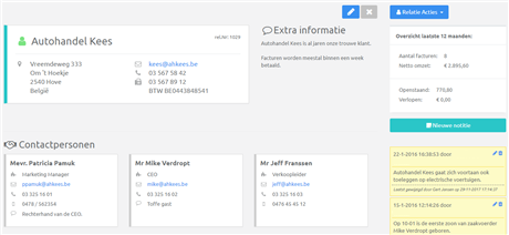 Bij grotere bedrijven heb je vaak met meerdere personen contact. Geen probleem voor Bilansoft, die voer je netjes in. Is er een vast facturatiecontact, dan kun je dat aangeven, maar je stuurt net zo vlot je facturen naar een van de andere contacten.